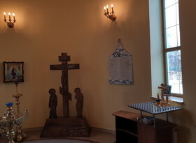 На момент нашего посещения, в храме уже находилась небольшая табличка – она была размещена неподалёку от креста и смотрелась композиция, прямо говоря, не лучшим образом. Надписи мелкие, практически не читаемые, да и сам мрамор, даже находясь в закрытом помещении, потускнел и утратил презентабельный вид.